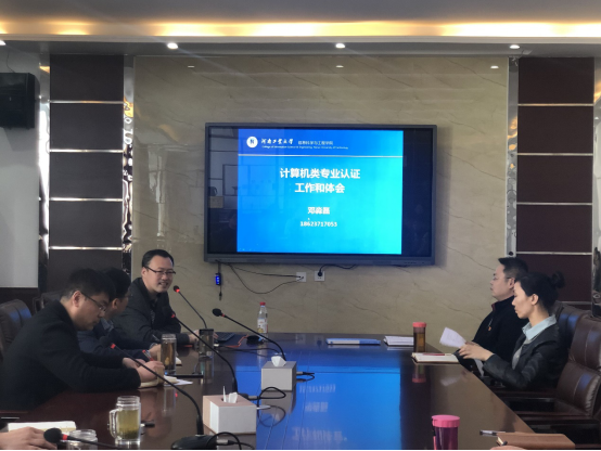3月18日下午,河南工业大学信息科学与工程学院副院长邓淼磊教授应邀来我院指导计算机类专业认证工作,认证交流会在10#A311会议室召开。院长何宗耀出席并主持会议,我院各教研室主任及任课教师参与了本次交流会。