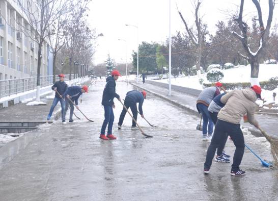 中午12点,志愿者们在十号楼大厅集合完毕,负责人随即给大家分配工具并安排扫雪任务。活动开始,志愿者们拿着扫帚、铁锹等除雪工具对路面上的积雪和薄冰进行全面清理,把过路的同学们引领到已清理过的安全道路上,同时告诫学生们冬季保暖的重要性,使同学们在寒冷的冬季感受到了一份浓浓的暖意。志愿者们不怕辛苦、不惧寒冷,在寒风中与积雪进行着斗争,他们的身影也成为了校园里一道靓丽的风景线。最终经过志愿者们的不懈努力,道路上的积雪薄冰全部清理完毕,恢复了原来的样貌。