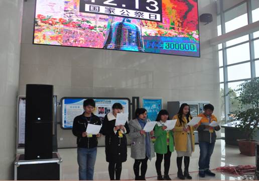 (通讯员:张星 穆明臻 赖小华 王顺强)。为了悼念南京大屠杀死难者,揭露日本侵略者的战争罪行,在第二个南京大屠杀死难者国家公祭日来临之际,河南城建学院计算机科学与工程学院青年志愿者与平顶山市文化艺术中心于2015年12月13日联合组织开展了以“勿忘国耻,振兴中华”为主题的纪念诵读活动。