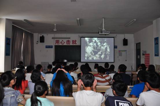 (图为同学们认真观看电影学习革命先烈先进事迹)