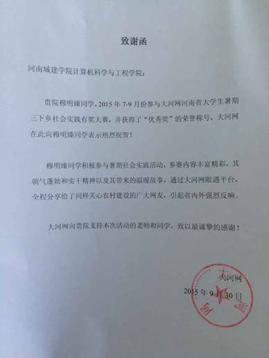(通讯员 张星 胡杭肖)为了呼吁当代大学生积极参与社会实践活动,使大学生能够深入了解社会状况,大河网于2015年七至九月份举办了“2015河南省大学生暑期社会实践有奖大赛”,河南城建学院计算机科学与工程学院穆明臻同学荣获优秀奖,近日计算机学院收到大河网发来的致谢函。