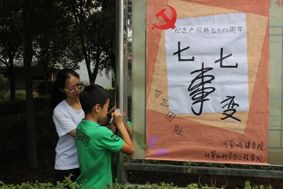(通讯员 张星 王庆)七十八年前的这一天,侵华日军发动了震惊中外的“卢沟桥事变”,七七事变是日本帝国主义全面侵华战争的开始,也是中华民族进行全面抗战的起点。是每个中华民族的儿女都必须铭记的历史。今天是七七事变七十八周年纪念日,为了牢记历史,弘扬爱国精神,河南城建学院计算机科学与工程学院的暑期社会实践的志愿者们在湖光花园小区举办了“七七事变”宣传纪念活动。