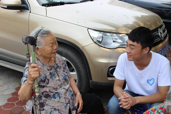(图为志愿者耐心与孤寡老人交谈)