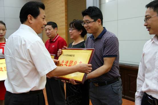 (图为计算机学院党总支副书记何宗耀从校长孔留安教授手中接过“先进团总支”荣誉奖牌)