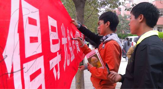 同学们在横幅上签下自己的名字