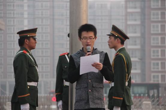 7点整,国旗班的旗手们着装整齐,迈着矫健的步伐,护着鲜艳的五星红旗入场。随着五星红旗的冉冉升起,全场师生庄严肃立,行注目礼。随后,学生代表晁德瀚同学做了国旗下的发言,他表示当代大学生作为祖国的建设者,应该积极响应党的号召,关注当代社会的核心价值观,学习和弘扬以爱国主义为核心的民族精神和以改革创新为核心的时代精神,从优秀传统文化中汲取营养,激发爱国热情。