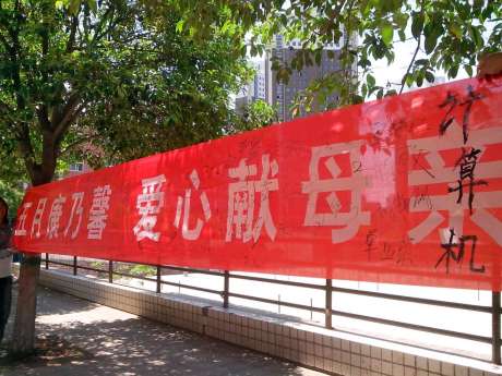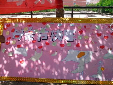 活动中,参与的同学纷纷在“五月康乃馨 爱心献母亲”的条幅上签名,并且用便利贴在计算机学院制作的展板上贴上了对母亲的祝福。