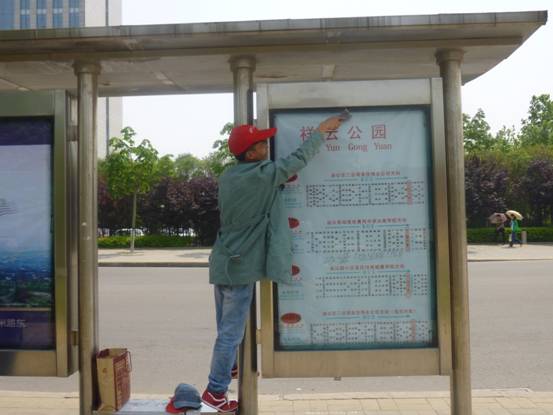 志愿者在清理公交站牌