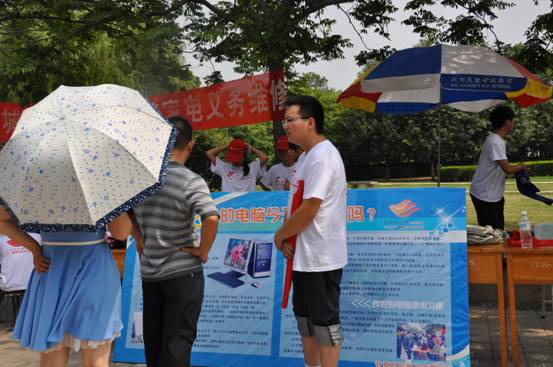 活动分为宣传、咨询、培训和维修四个部分。负责宣传的队员走上街头,一边发放宣传单,一边向行人宣传电脑维护基本常识。他们对此也表现出极大的兴趣,纷纷前往会议室进行咨询;志愿者热情接待,耐心回答咨询者提出的问题。培训的志愿者细心地为大家讲解电脑的基本常识,教大家关于word排版、PPT的制作等一些简单的知识。尽管外面烈日炎炎,讲解的志愿者都口干舌燥,但大家的热情依然高涨。广大队员本着服务居民,为其排忧解难的信念,不畏天气阻挠,以执着的精神,赢得了当地众多居民的赞许。部分居民反映,他们家中的电脑存在严重的问题,于是志愿者亲自上门维修,细心对电脑进行故障检测,通过理论知识和实战经验排除了电脑故障,并为居民讲解以后应该如何维护自己的电脑,提醒他们注意电脑病毒入侵。