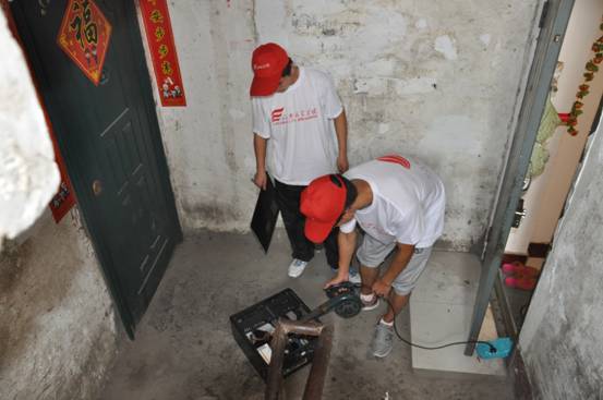 首先,我们按照事先安排好的,每两人一组,总共分成了5个小组,每组负责两个单元楼,然后分头行动。在小区的树荫下第一组的志愿者们碰到了纳凉的李叔,在知道了我们是进行免费电脑维修的大学生志愿者后,他很高兴,他说:“最近家里的电脑在刚开机时,老是发出轰轰的声音,也不知道是哪里出问题了,这下可好了,你们可以帮我去看看了。”于是,我们跟随着李叔来到他家。经过志愿者的检查,发现是由主机箱没有经常清理造成灰尘积累过多导致的,随后,志愿者们拿出随身携带的电脑维修工具帮李叔清理主机。