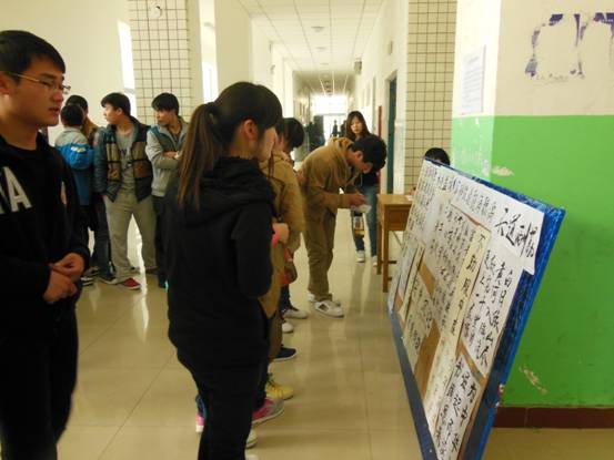 此次书法大赛共征集并展出作品四十多份,出展作品包括硬笔书法、软笔书法以及各种绘画作品。此次比赛舍弃传统的评选方式,采用将所有参赛作品隐藏作者信息进行编号并在大厅展示,到场参观者可现场无记名投票的方式进行。此举确保了每份被选出的作品都得到了大家认可,使比赛更加公平公正。经过半个多小时,近百余名同学为自己满意的作品投票,学生会相关人员对票数做出了统计,并根据票数的高低,选出优秀作品14份。