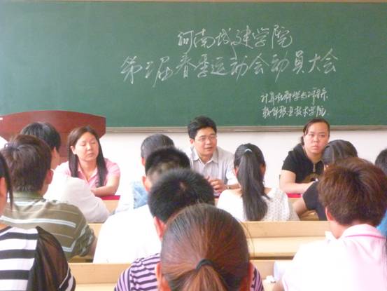 (通讯员 张星)2012年5月8日下午1点,在十号教学楼A110教室,计算机科学与工程系举行了“河南城建学院第三届春季运动会”动员大会。系党总支副书记何宗耀,系团总支书记张星、团总支副书记刘艳杰,系学工办副主任杨恒,系学生会主席团、学生会部分成员以及全体参赛队员参加了会议。