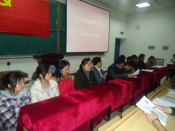 2010年12月21日18:30,计算机科学与工程系党总支学生党支部在十号教学楼B105召开党员发展暨转正大会。大会的主要议题是讨论本系48位同志的入党问题以及43位同志的转正问题。计算机科学与工程系学生党支部正式党员52名、预备党员113名和发展对象48名,共165人参加本次会议。