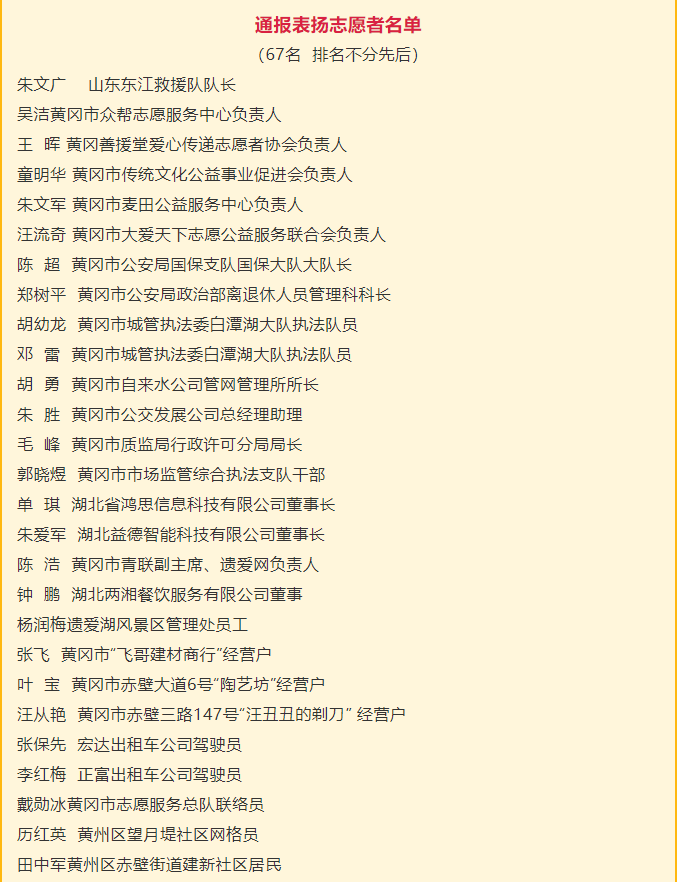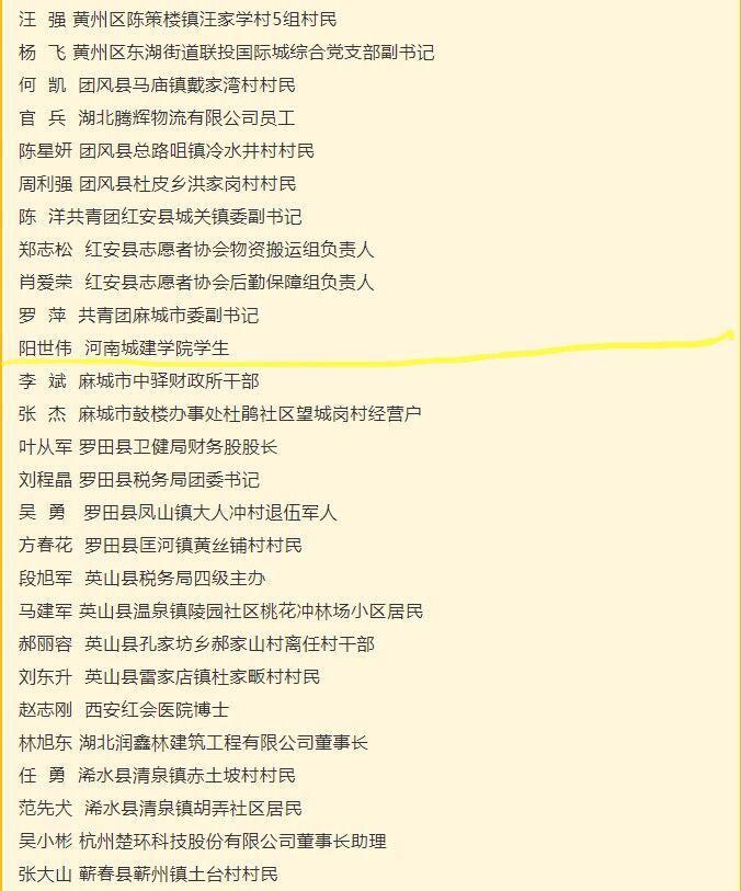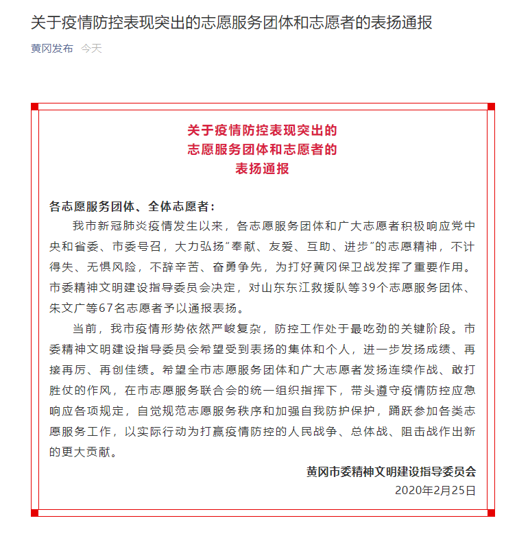 2月25日,黄冈市委精神文明建设指导委员会发布了《关于疫情防控表现突出的志愿服务团体和志愿者的表扬通报》,阳世伟位列通报表扬志愿者名单之中,该表扬通报发布在“黄冈发布”公众号中。