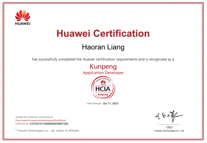 学生获得的华为鲲鹏应用开发者HCIA认证证书