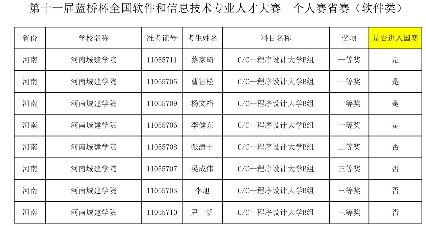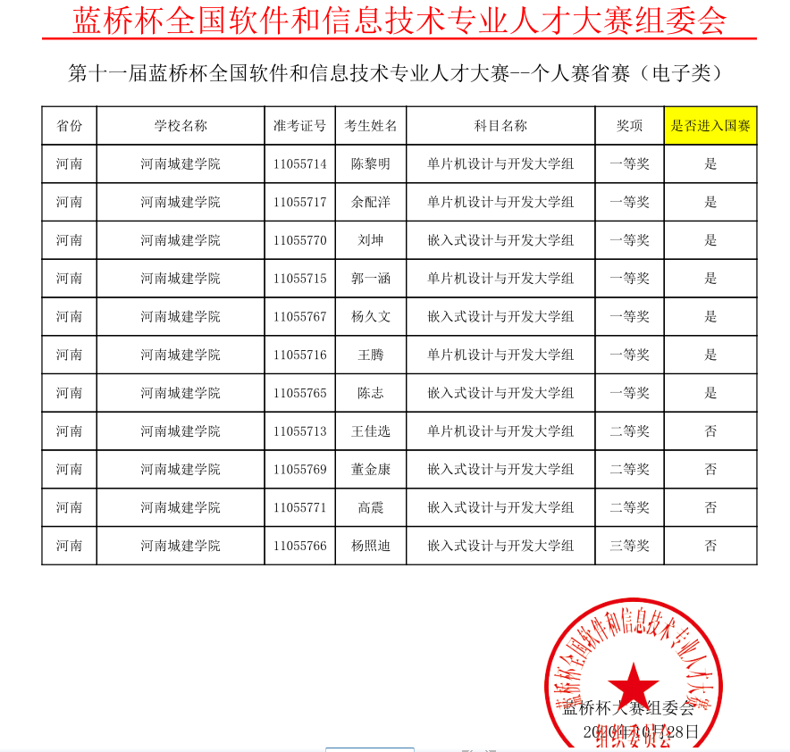 (通讯员 周岸 杜小杰)近日,我校承办的第十一届“蓝桥杯”全国软件和信息技术专业人才河南赛区比赛竞赛结果出炉,我校学生再创佳绩。在本次比赛中,全省来自郑州大学、河南大学、河南师范大学、河南理工大学等80所高校的4535名选手同台竞技,软件类参赛选手3431人,电子类参赛选手1104人。由于疫情原因,今年的赛点设在各大参赛院校,比赛项目涵盖C/C++程序设计、JAVA软件开发、单片机设计与开发、嵌入式设计与开发四大竞赛科目。