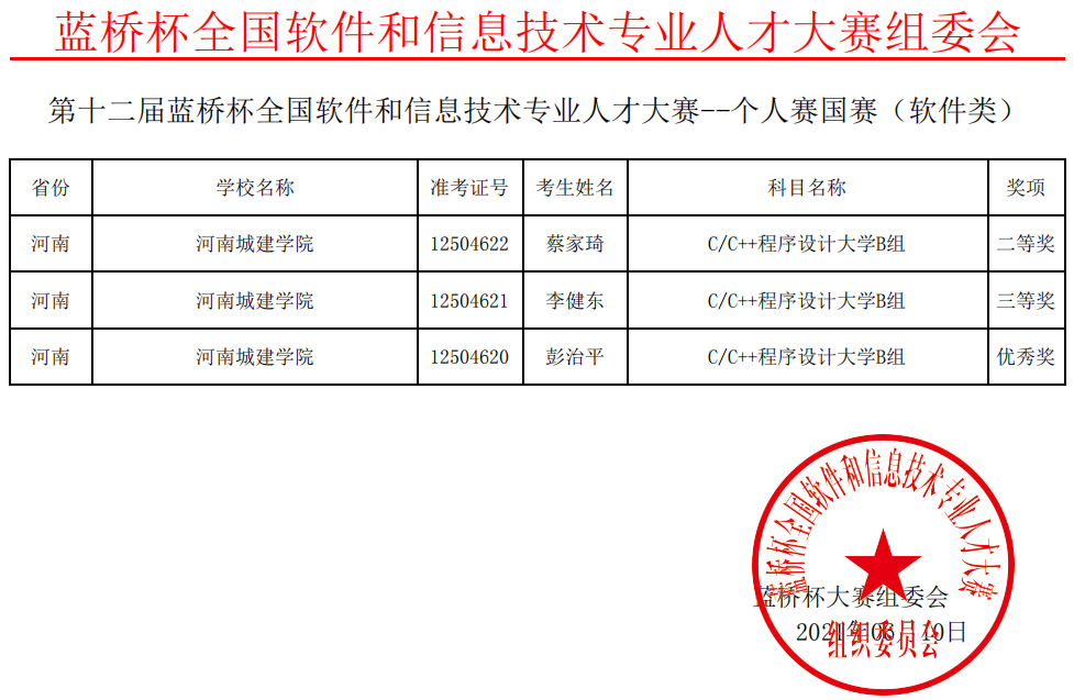 (通讯员 杜小杰)6月10日,2021年6月5日举办的第十二届“蓝桥杯”全国软件和信息技术专业人才大赛全国总决赛成绩出炉。计算机学院赵军民,刘荣辉,苏静枫,杜小杰等老师指导的学生在本次比赛中取得优异的成绩,其中蔡家琦、陈黎明同学荣获国家总决赛二等奖,李健东同学荣获国家总决赛三等奖,我校被评为“优秀组织奖”。这充分体现了我校学生学习能力、专业素养、综合素质在不断增强。“以赛促教,赛教融合”是教学模式改革的重点,也是高技术应用型人才实践能力的一种体现,望广大同学积极参与到各种专技竞赛中去,在比赛中提升锤炼专业本领,不断提高个人综合实践能力。