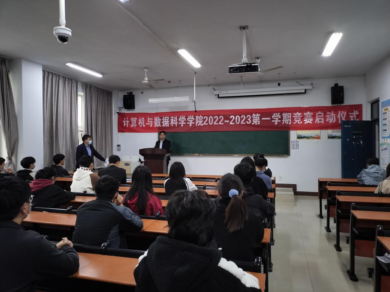 在启动仪式上,各系主任基于各自专业特点,向同学们详细介绍了比赛内容和奖项评定细则,赵军民从专业竞赛的目的、意义和重要性等方面与同学们进行了深入的交流。他说,计算机学院自2022年上半年开始组织实施“1专业-1学期-1竞赛”活动,教育引导不同专业、不同年级的学生积极参与比赛,以赛促学、以赛促教。通过专业竞赛,培养大学生实践能力、专业素养及团结协作能力,为大学生就业增加砝码,实现人才培养与教学质量双提升。