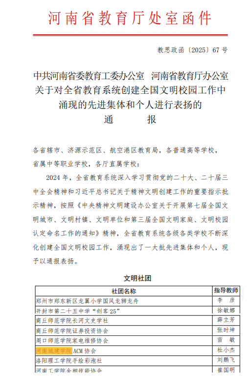 (通讯员:杜小杰)近日,中共河南省委教育工委办公室、河南省教育厅办公室联合发布《关于对全省教育系统创建全国文明校园工作中涌现的先进集体和个人进行表扬的通报》。经资格审查、专家评审、综合评议等环节,我校yl9193永利集团“ACM协会”脱颖而出,荣获“河南省高校文明社团”称号。