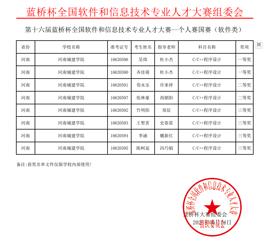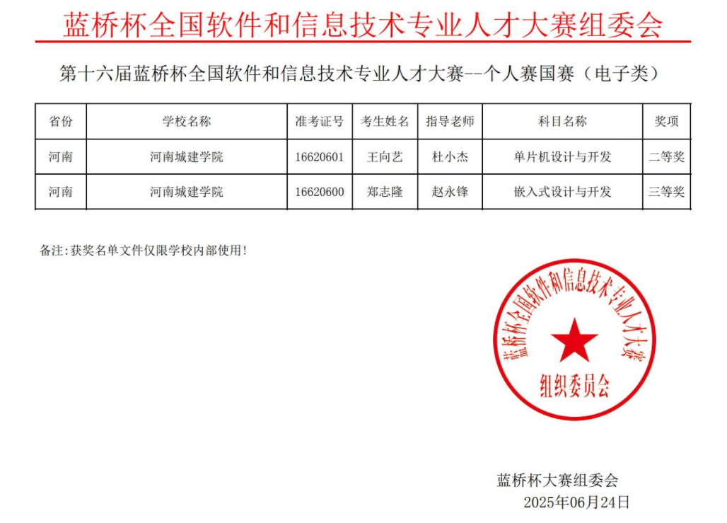 2025年6月15日,第十六届蓝桥杯全国软件和信息技术专业人才大赛全国总决赛成绩出炉。经过激烈角逐,我校计算机学院学子在杜小杰等教师的指导下,凭借扎实的专业技能与出色的实践能力,在比赛中再创佳绩。本届比赛,我校计算机学院共有10名学子晋级全国总决赛(软件类8人、电子类2人),最终斩获一等奖2项、二等奖3项、三等奖5项,展现了我校学子的卓越实力。