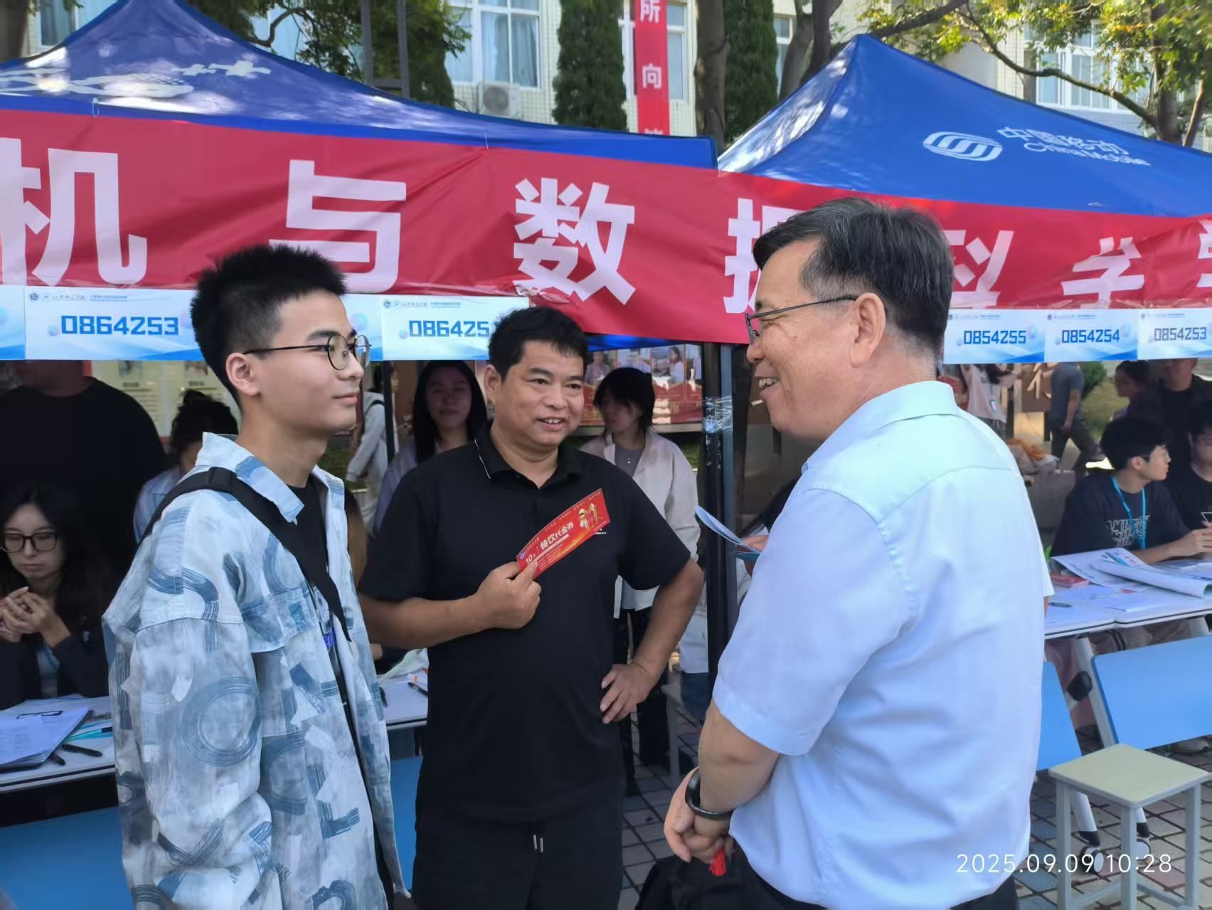 本次迎新活动中,学院精心策划,在报到点推出了多项创意互动项目,包括“人脸识别飞机大战”、“AI摄影留念”和“学科成长树”等,吸引了大量新生踊跃参与,现场气氛热烈,欢声不断。校党委书记范晓伟莅临学院迎新点,与报道新生亲切交谈,详细询问了同学们的住宿安排等事项。