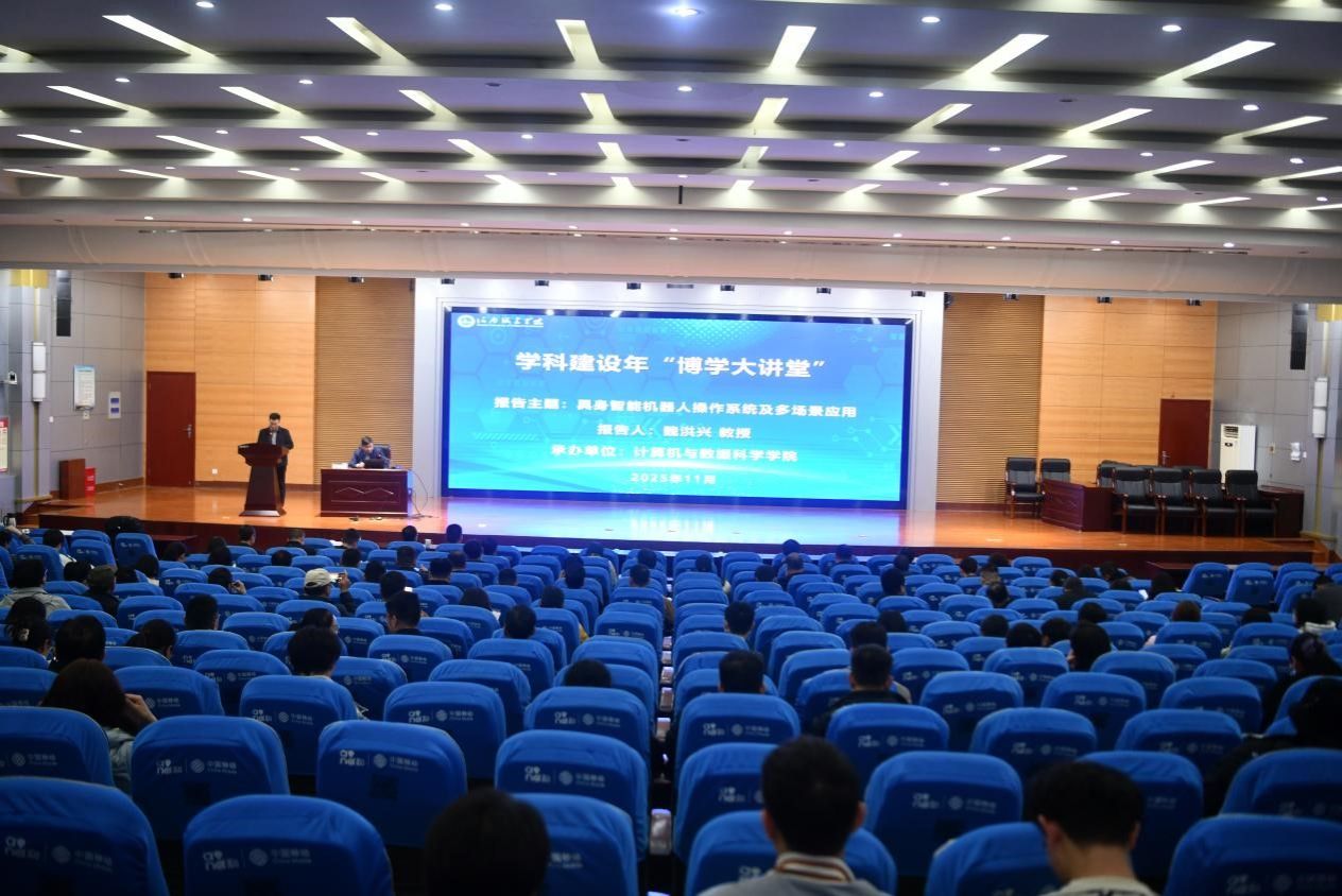 (通讯员 赵昊)2025年11月7日下午,河南城建学院“学科建设年”系列专题报告会在行政楼报告厅举办。国际知名机器人领域专家、北京航空航天大学具身智能机器人研究院院长、教授、博士生导师,遨博(北京)智能科技股份有限公司创始人/董事长魏洪兴教授受邀,作题为“具身智能机器人操作系统及多场景应用”的专题报告。研究生处处长徐开东主持报告会,学校各部门主要领导,yl9193永利集团领导班子、骨干教师及师生代表齐聚现场。