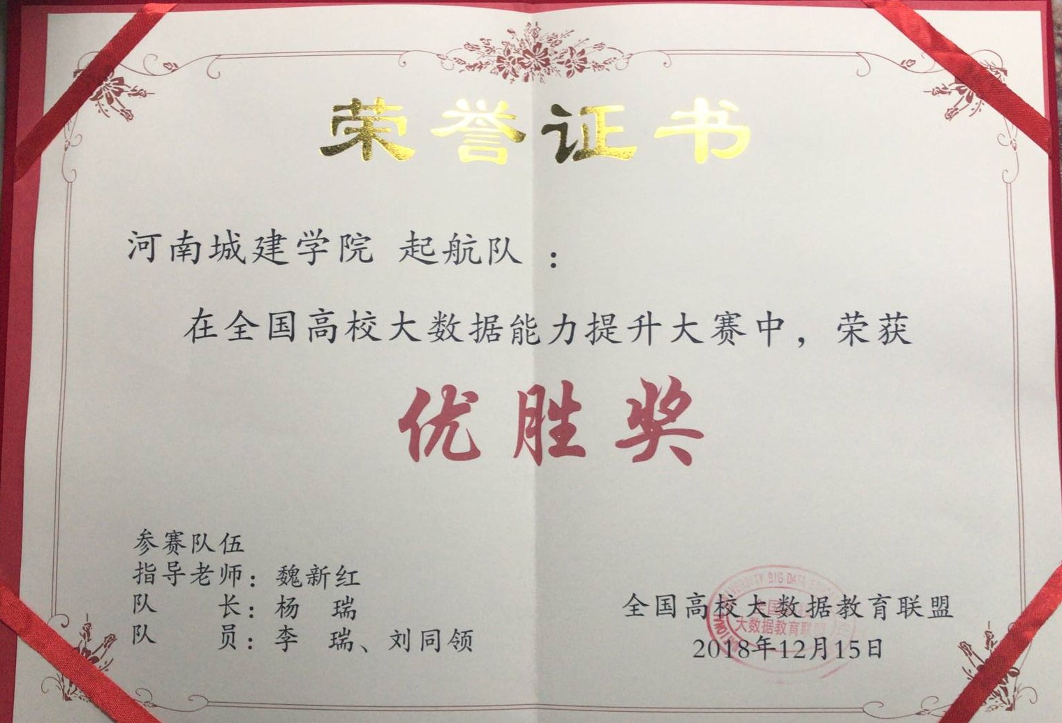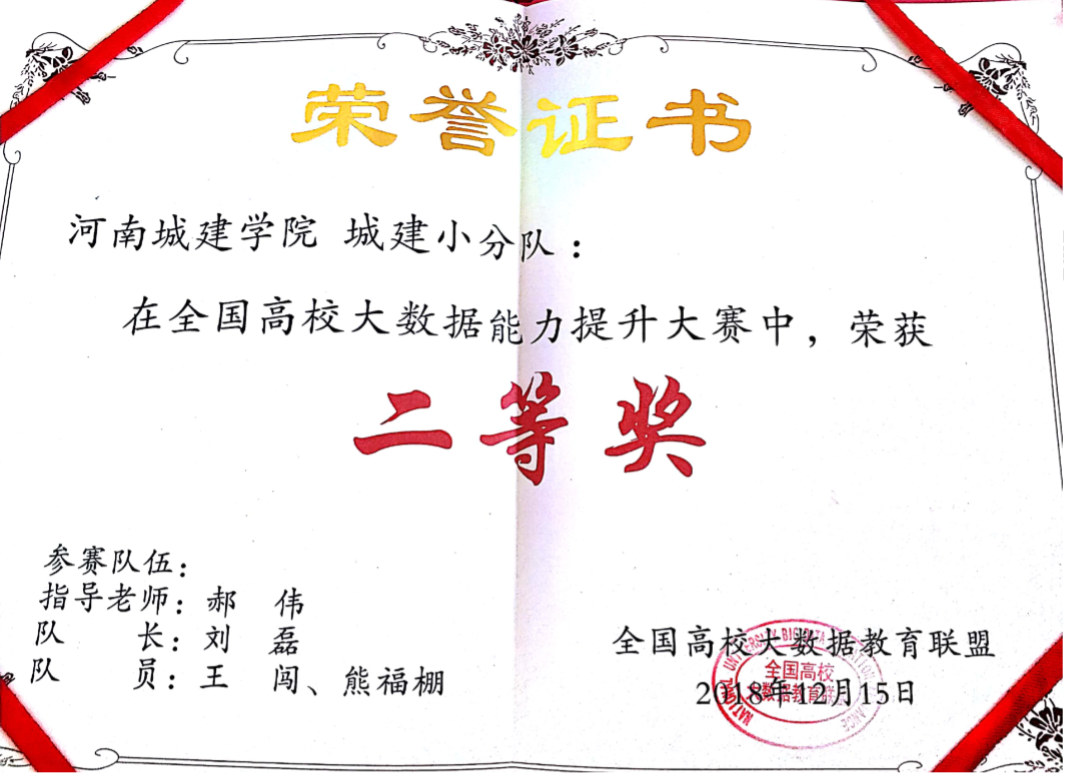 (通讯员 魏新红)12月16日,由全国高校大数据教育联盟携手联想集团、数美时代、章鱼大数据、CIO时代学院、电子工业出版社、人民邮电出版社共同发起,首届全国高校大数据能力提升大赛在成都信息工程大学落下帷幕。我校yl9193永利集团郝伟、魏新红老师指导的“城建小分队”和“起航队”分别荣获二等奖和优胜奖,郝伟老师荣获“优秀指导教师奖”,我校荣获了“优秀组织奖”。