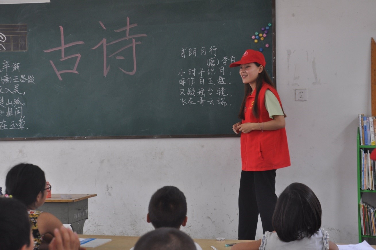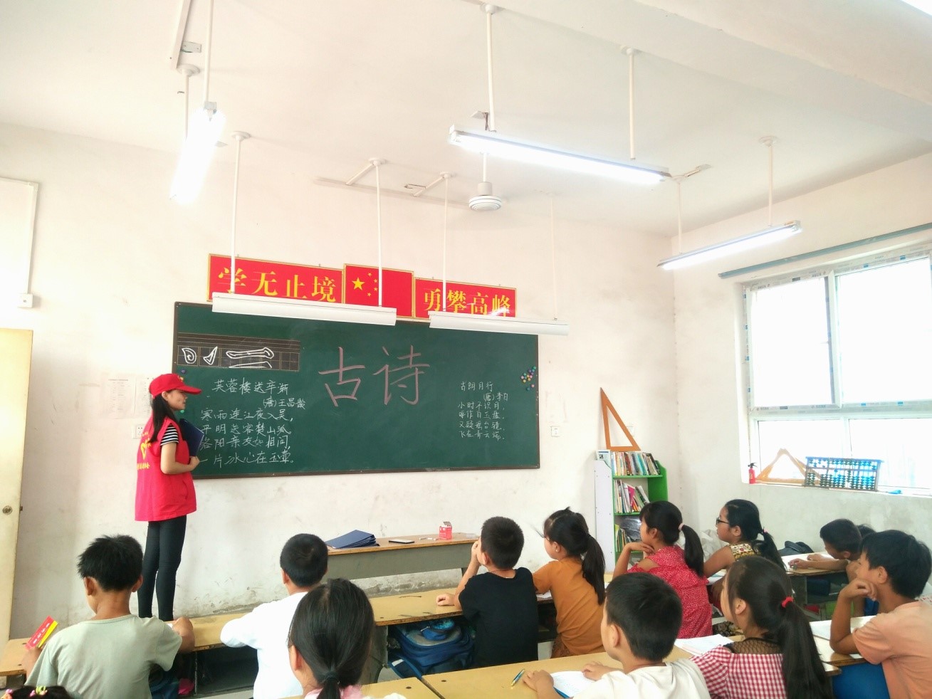 7 月 18 日上午,团队成员跟随指导老师走进城关乡孟北小学,学校校长组织学生安静整齐的坐在教室。团队成员先与小学生进行了简单的沟通,大概了解学生的普通话程度以及识字情况。然后在志愿者的带动下,课堂在小学生自觉站起来用标准的普通话背诵古诗的浓浓书香味中逐渐展开。队员们先带领小学生朗读古诗,他们不仅想读会古诗,更想深入了解古诗背后的故事。接着,已做过充分准备的志愿者就给他们讲解了作者的简介、古诗创作时的背景以及古诗的译文。最后,一位学生站起来说她想识更多的字,学会更多的古诗并且会认真学习标准的普通话,长大以后要用标准的普通话和正确的表达把古诗以及古诗的故事生动形象地讲给更多的人听,让更多的人了解古诗的文化!