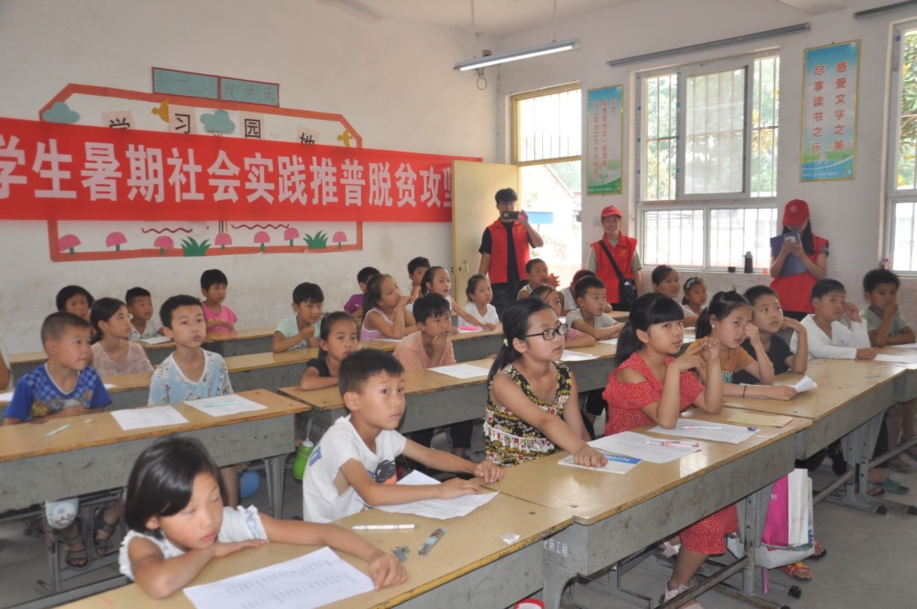 (通讯员 王梦琪)为了让同学们从小养成讲普通话的好习惯,加大普通话的推广力度。河南城建学院计算机学院“蒲公英”志愿服务队于 2019 年 7 月 18 日走进叶县城关乡孟北小学,开展“讲解中国古诗词”小课堂,让小学生体会汉字语言的魅力从而切实感受到说普通话的意义。