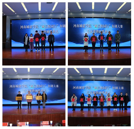12月24日上午,经过学校半决赛,两组作品都杀出重围进入决赛。同日下午,我校在行政楼学术报告厅成功举办“诚信校园行”校园短剧大赛总决赛暨颁奖典礼。校党委委员、副校长王靖,相关职能部门负责人、各学院党总支副书记、学生资助工作负责人、学生代表近500名师生共同出席观看校园短剧大赛总决赛。