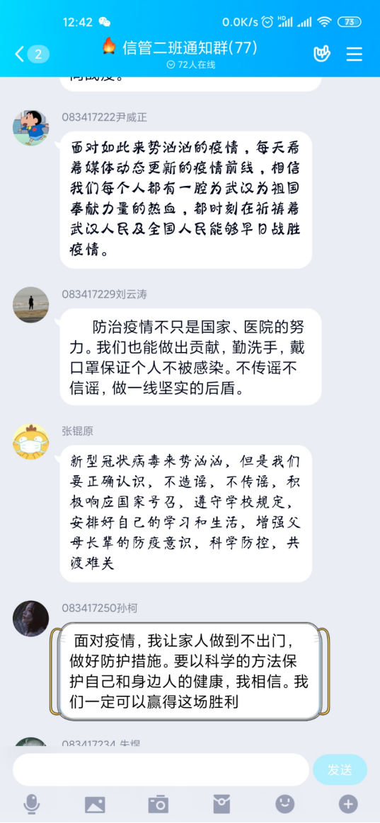 在党中央的坚强领导和社会各界的努力下,新型冠状病毒患者治愈率有所提高,新增病例大大降低。作为当代大学生,我们更有责任、有义务重视疫情,熟知相关防控知识。现在,同学们虽各处一方,但都在做着同样一件事情——认真地观看新冠病毒防控知识。在老师及班委的指导下,同学们都非常重视这次授课,认真观看视频的每一部分,对居家期间、返程期间、在校期间的个人防护,口罩的佩戴、消毒,饮食健康,心理调节等内容重点关注,结合自身情况学以致用。