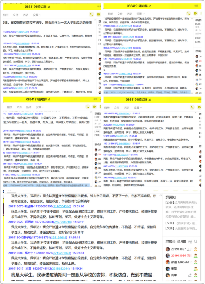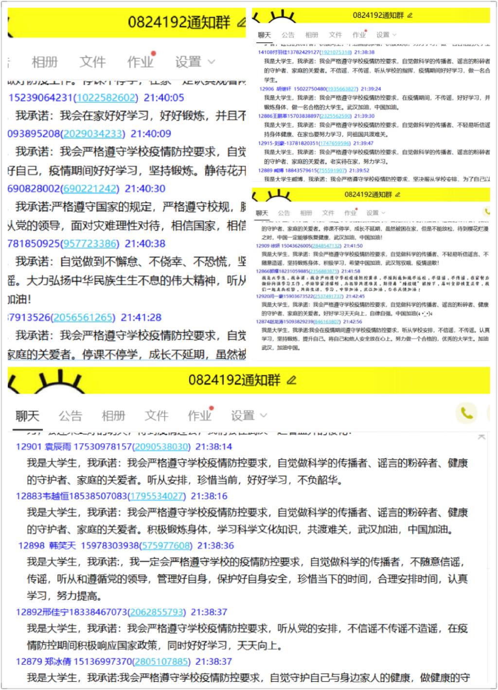 班会的第二个环节是学习身边的战“疫”课堂。在辅导员的带领下,同学们在线上观看了短片《白衣长城》,向奋战在一线的白衣天使致敬。接着,大家观看了班级自制的加油视频,再次为武汉加油,为祖国祝福。随后,辅导员列举身边的榜样事迹,引导大家要心中有榜样,向榜样看齐。辅导员周岸这样说:“最美逆行者阳世伟、党员胡凤瑞、毕业生党员边亚星、大学生志愿者李洋、积极分子张子轩、翟德道等等,他们在家乡一线当起了防疫志愿者,是我们身边的榜样。我们能做的也许不多,但管好自己,做好自己该做的,就是最好的贡献了。”同学们为这些身边的榜样事迹所打动,纷纷发言表示“无论何时当祖国需要我时,我定当挺身而出。”同学们积极活跃,班会气氛严肃而热烈。