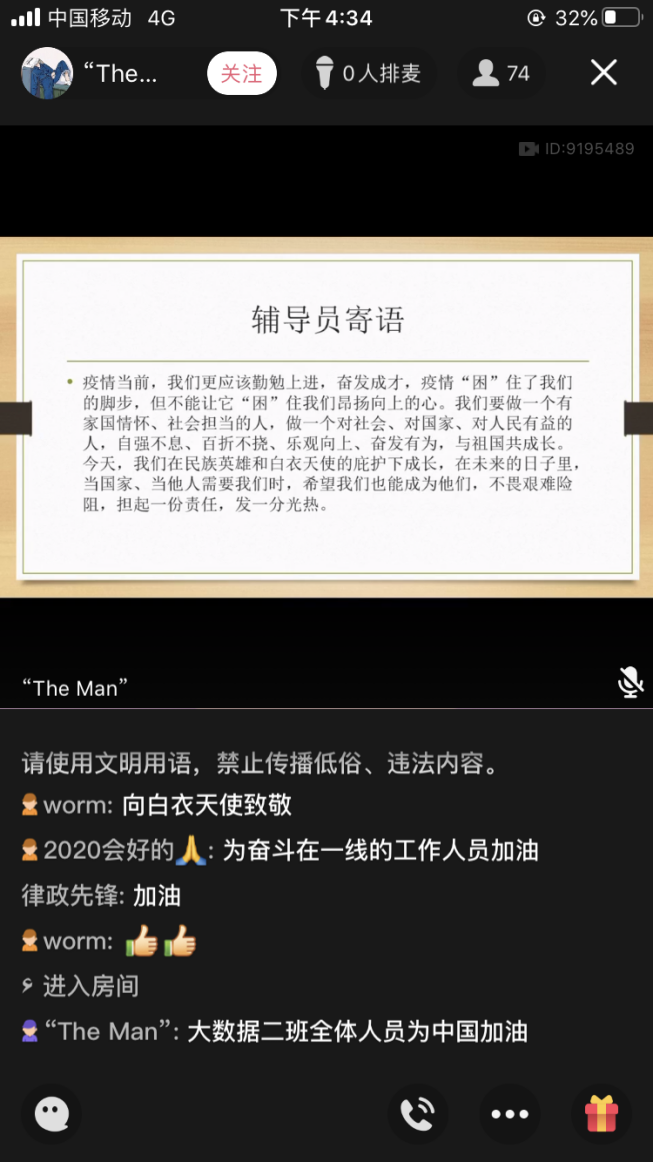 19级主题班会采取QQ直播的方式,班会分为防疫专题学习、身边的战“疫”课堂、“学不可以已”和“一句话承诺”四个部分,班会内容丰富,同学们积极活跃,班会气氛严肃而热烈。19级辅导员周岸借助抗疫这一特殊的一课,引导同学们严格遵守学校疫情防控要求,珍惜当下,勤勉上进,做一个对社会、对国家、对人民有益的人,自强不息、乐观向上、奋发有为。