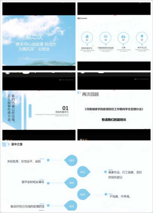 在防疫专题中,发言的学生代表们分模块介绍了防疫科普知识,教大家如何选用口罩、如何正确洗手等在日常生活中需要注意的防疫事项,学生代表的讲述生动、内容丰富、做法简单易懂,赢得同学们的纷纷点赞。防疫专题的第二部分是疫情防控要求,在各班班长带领大家认真学习《河南城建学院疫情防控期间学生管理办法》的基础上,辅导员再次向同学们重点强调要严格遵守学校疫情防控要求,严格执行学校信息上报制度,并结合实际案例提醒同学们注意疫情期间的防诈骗。