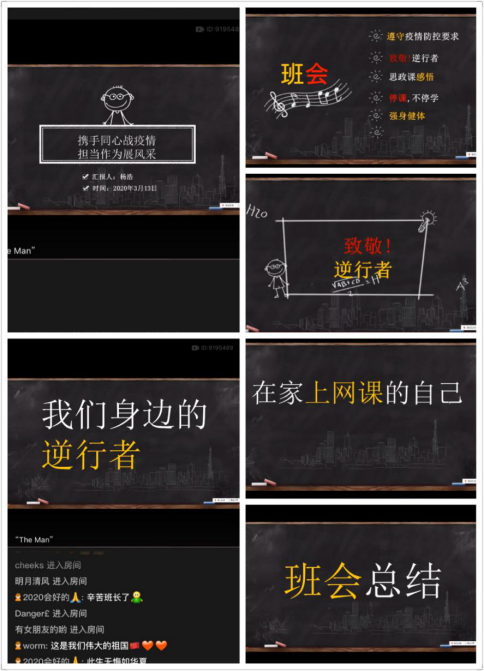 此次“云班会”,各年级结合实际情况,围绕专题学习、思想政治教育、学风引导等方面展开,各有特色。“云班会”在积极宣传抗击疫情过程中身边的正面典型的同时,教育引导学生构建正确的世界观、人生观、价值观,培养学生爱国爱民的家国情怀和励志勤学的奋斗精神,激励同学们用实际行动践行报效祖国、奉献社会的担当和使命。