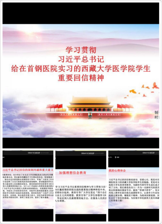 班长向同学们介绍了习近平总书记给在首钢医院实习的西藏大学医学院学生回信的背景,并朗读了习近平总书记的回信内容。接着,他带头发言表示作为新时代的共青团员,会积极响应国家号召,做到“停课不停学”,认真学习专业知识,锤炼实干精神,为将来回报祖国、回报社会打下坚持基础,为实现中华民族伟大复兴贡献自己的青春力量。