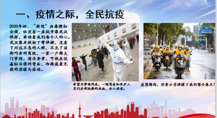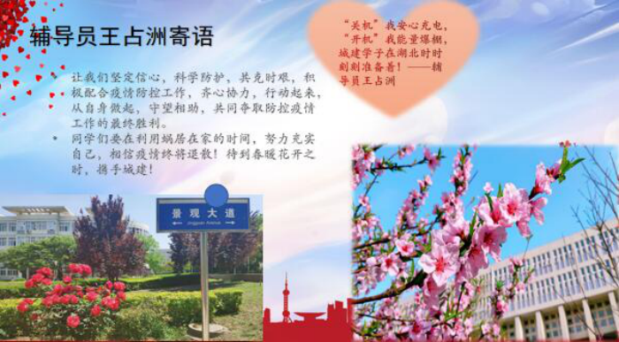 会议第一项,主持人回顾疫情期间温暖的瞬间,展示疫情期间为我们默默奉献的动人的故事,向为抗击疫情做出贡献的人表示致敬。接着,辅导员和湖北籍学生发表共同抗疫寄语,把美好的愿景通过寄语传达出内心的爱与希望。随后,主持人讲述疫情期间调节心理健康的办法,强调疫情期间要以积极的心态面对生活。辅导员王占洲进行了视频连线慰问,及时了解学生在家学习生活情况,帮助学生坚定信心,平稳度过疫情关键期。每位同学分别就此次疫情防控发表了自己的感想,纷纷表达了对学院的感谢,对祖国的热爱!最后,辅导员王占洲做会议总结,表示同学们应提高自己站位、按照学校、学院要求开展学习进度,充分利用好居家学习的时间,做好个人防护,有困难随时联系学院领导和辅导员。再次强调作为湖北籍学生要按时报平安,配合学校关于疫情防控工作部署。