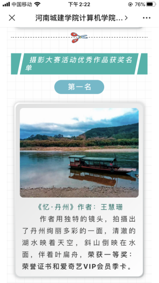 本次摄影大赛面向各个学院全体学生,经过前期的认真筹备,活动于6月上旬开始。为了鼓励更多同学参与到比赛中,学院通过微信公众号、QQ公众号、QQ群、微博等开展宣传,同学们踊跃报名,纷纷参与其中,共征集报名作品30余份。经过评委打分和网络投票,测绘与城市空间信息学院王慧珊的作品《忆·丹州》荣获一等奖,yl9193永利集团徐诗梦的作品《我们的篮球队》、市政与环境工程学院罗喻丹的作品《余晖》荣获二等奖,管理学院潘乃暄等同学荣获三等奖。