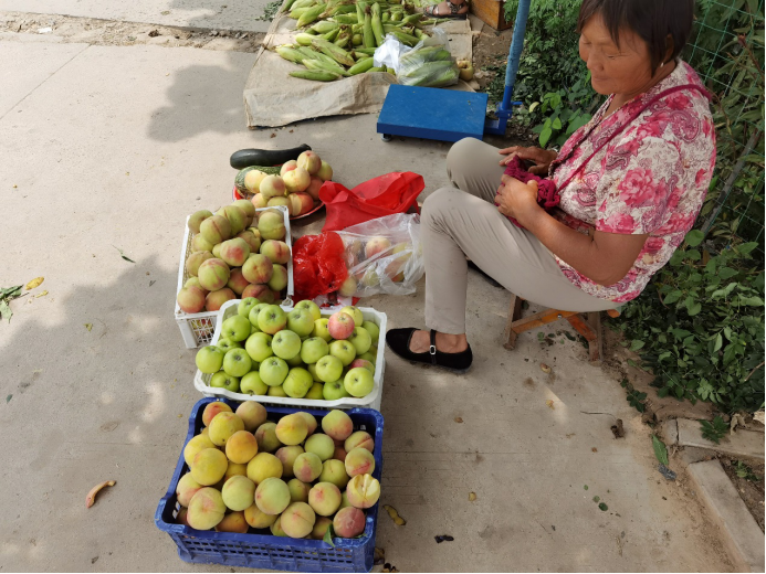 图为家乡农户正在城镇街道边售卖当季农副产品