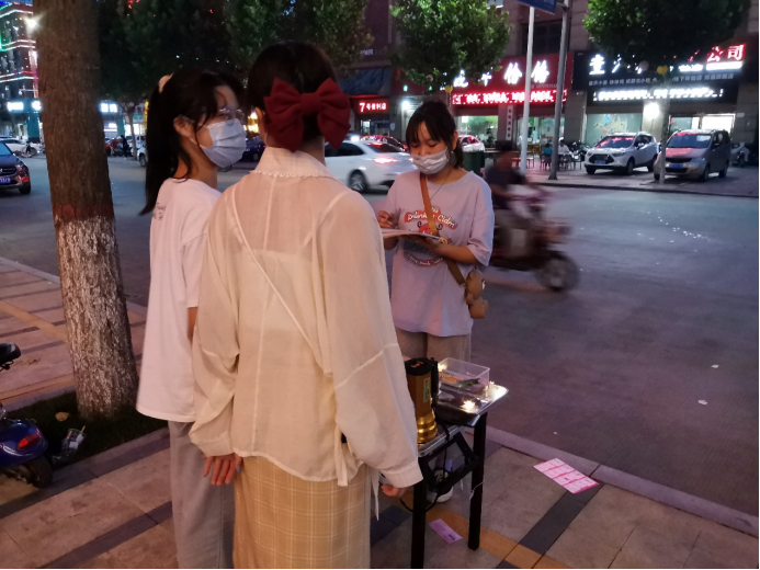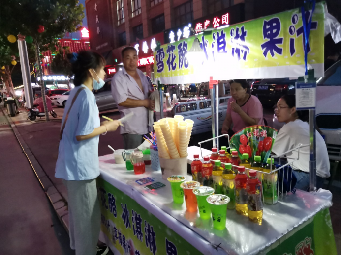 7月26日起,春雁返乡行动团成员走进河南省信阳市浉河周边天伦广场以及平顶山市郏县城,对当地摆地摊情况进行深入调研。实践队员首先采访到的是卖饮品的一对夫妇,据他们所说,原本夫妇二人是在北京打工的,因为疫情的原因,回家过年一趟就回不去了,想着家里还有老人赡养和学生上学,于是就想着找门副业,挣点生活费。正巧国家鼓励百姓复工复产,实行地摊经济,于是就摆起了地摊。每天的工作就是上午将要用到的材料准备好,下午一点后就推着小车在街头售卖,到四五点的时候还要赶到人多的广场。在问到摊主每天的销量和收入时,摊主说,天气好的话一般是一百多杯,然后一杯的利润大约是两块,但是,销量每天都不固定,跟天气等因素都有关系。摊主表示,“国家这个政策放开后确实给我们这些停业在家的人工作的机会,让我们可以有点小收入,维持生计。”