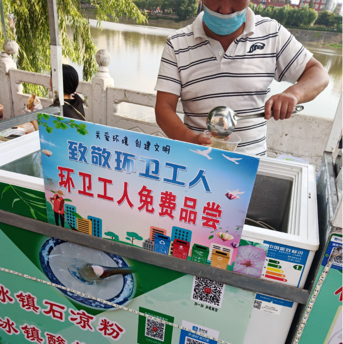 在浉河边的一家冰粉摊,实践队员发现摊位上挂有“环卫工人免费领取”的字样,经过采访,队员得知是摊主为特意致敬为浉河美好环境辛苦付出的环卫工人们特意定制的宣传牌,他说,“天气炎热,这些大爷大妈还在浉河边清理垃圾,为打造大美浉河辛苦付出,真的很伟大,我也没什么可以做的,就想着让这些路过的工人免费吃一口冰粉消消暑。”