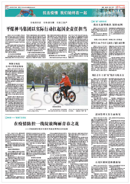自新冠肺炎疫情发生以来河南城建学院广大学生群体积极响应号召,在各自的家乡参与疫情防控志愿服务活动,为抗击疫情贡献青春力量。他们一往无前,无惧无畏诠释着不辱时代使命、不负人民期望的真正含意。他们用自己的方式承担着青年一代应有的责任与担当,在工作中用自己的坚守,彰显着青年一代不畏艰险、冲锋在前、真情奉献的精神风貌。