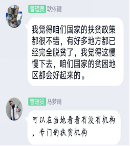 因疫情原因,服务队成员不能相聚一起,服务队就借助QQ群,积极讨论实践方案、方式、具体流程。每位成员深入当地基层,按策划践行各自实践任务,并即时在群中发表所思所想,服务队团结一致,虽相距遥远,但一颗颗为扶贫贡献的炽热之心将他们紧紧连接在一起。实践队成员发放关于家乡当地旅游业发展、互联网使用等相关情况的调查问卷,以更加深入了解基层脱贫概况。他们随机询问当地村民对旅游业采用电子信息化管理的看法,并结合自身所学知识对调查问卷上的问题耐心阐释,向他们介绍互联网+知识及其在助力扶贫中的作用。
