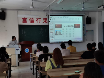 活动前,主持人员充分准备,在深入了解九一八事件后,与参会人员互动,观察同学们对九一八事件的了解程度,然后在简述九一八事件的过程。由领唱人员带领,全体师生起立齐唱国歌。紧接着,全体师生默哀三分钟,以此来纪念、敬仰先贤勇士们。随后,就到了电影《南京南京!》播放的环节,该电影讲述了在抗日战争期间,中华人民与侵略者顽强抗争、遭受外国侵略者的迫害的事件。电影播放期间,不少的同学湿润了眼眶每位观看者都怀着沉重的心情,认真且敬仰的观看同胞们所受到的迫害。
