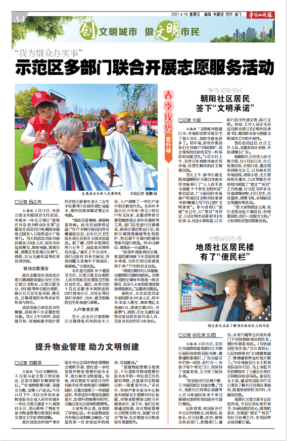 (通讯员 余美霞 周岸)4月15日上午,yl9193永利集团青年志愿者协会代表河南城建学院与社区青年志愿者协会在平顶山九天鹤大酒店旁草坪共同联合举办了“电脑维修”及其他各项互惠利民的志愿活动活动。活动中,我院志愿者们充分利用自身所学的专业知识,认真解决周边市民遇到的电脑难题,并向他们宣传电脑使用与维护方面的相关知识,赢得了市民的肯定和点赞,平顶山日报对此次活动进行了专题报道。此次活动弘扬和践行了雷锋精神,在实践中锻炼了我院志愿者们的动手操作能力,展示了我院学子良好的精神风貌。
