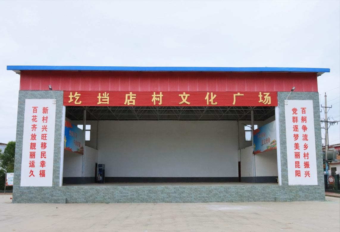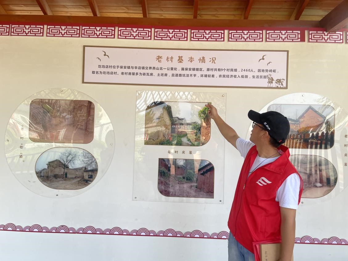 志愿者们通过参观村史长廊和当地村民以及领导的讲解了解到圪垱店村原位于叶县保安镇与辛店镇交界燕山北一公里处,因地势崎岖,取名为圪垱店村,老村房屋多为砖瓦房、土坯房,且道路坑洼不平,环境较差,农民经济收入低微,生活贫苦。2006年8月,根据国务院治淮工程战略需要,河南省人民政府决定对水患严重的沙颍河流域进行治理,在干江河支流上截燕山峡谷修建大型水库,圪垱店村村民响应国家兴修水利的号召,舍小家顾大家,实施了整体搬迁,1700多口人迁安至现址。新村距县城西南五公里,地处古老美丽的昆水河南岸,东临叶县最高教育殿堂第一高中,叶沙公路邻村而过,交通条件便利,地理位置优越。全村共1782人,耕地面积1600亩,近年来上级陆续在圪垱店移民新村投资资金600多万元,村内建了高标准的党群服务中心办公楼、小学教学楼,文化广场和沿河公园,村外良田新打了机井,新修了水泥路。为了增加移民收入。村“两委”积极引导群众调整种植业结构,选准高端蔬菜芦笋种植项目,大力发展。目前,全村种植芦笋1200亩,每亩收入达8000元左右。芦笋采摘季节,可为周边群众提供200多个就业岗位,解决了老弱妇孺等闲散劳动力的就业问题。