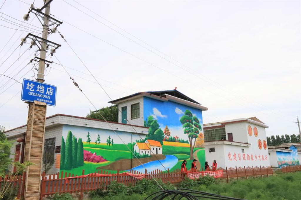 7月8日早上八点,志愿者们来到圪垱店新村,村口的展示牌上写着:产业兴旺、生态宜居、乡风文明、治理有效、生活富裕,这正是实施乡村振兴战略的目标。志愿者们排成一列纵队沿着宽阔平整的柏油路走进圪垱店村,映入眼帘的是小桥、流水、石亭、排房。热情的村民告诉志愿者们圪垱店新村是燕山水库的移民村,政府对村民们都很关心,房屋是统一建造的,美化绿化都令村民们十分满意,每家每户门前都有一个小型花园,鲜艳多彩的墙绘也给乡村增添了许多色彩,另外设立了移民扶贫项目促进乡村的经济发展。