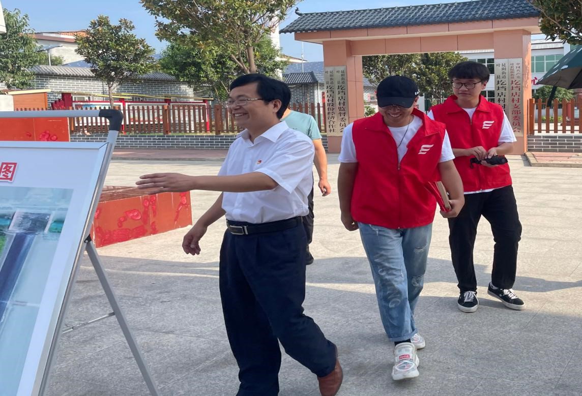 在热情村民的带领下,志愿者们来到圪垱店村文化广场。在干净宽敞的村史长廊内,志愿者们认真地观看村史画幅,了解圪垱店移民新村的发展。恰逢当日平顶山市领导也来到圪垱店新村,志愿者们和领导深入沟通,了解圪垱店新村的扶贫项目和民生发展,另外领导们十分高兴地为志愿者们讲解圪垱店新村的规划图以及未来的长期发展。