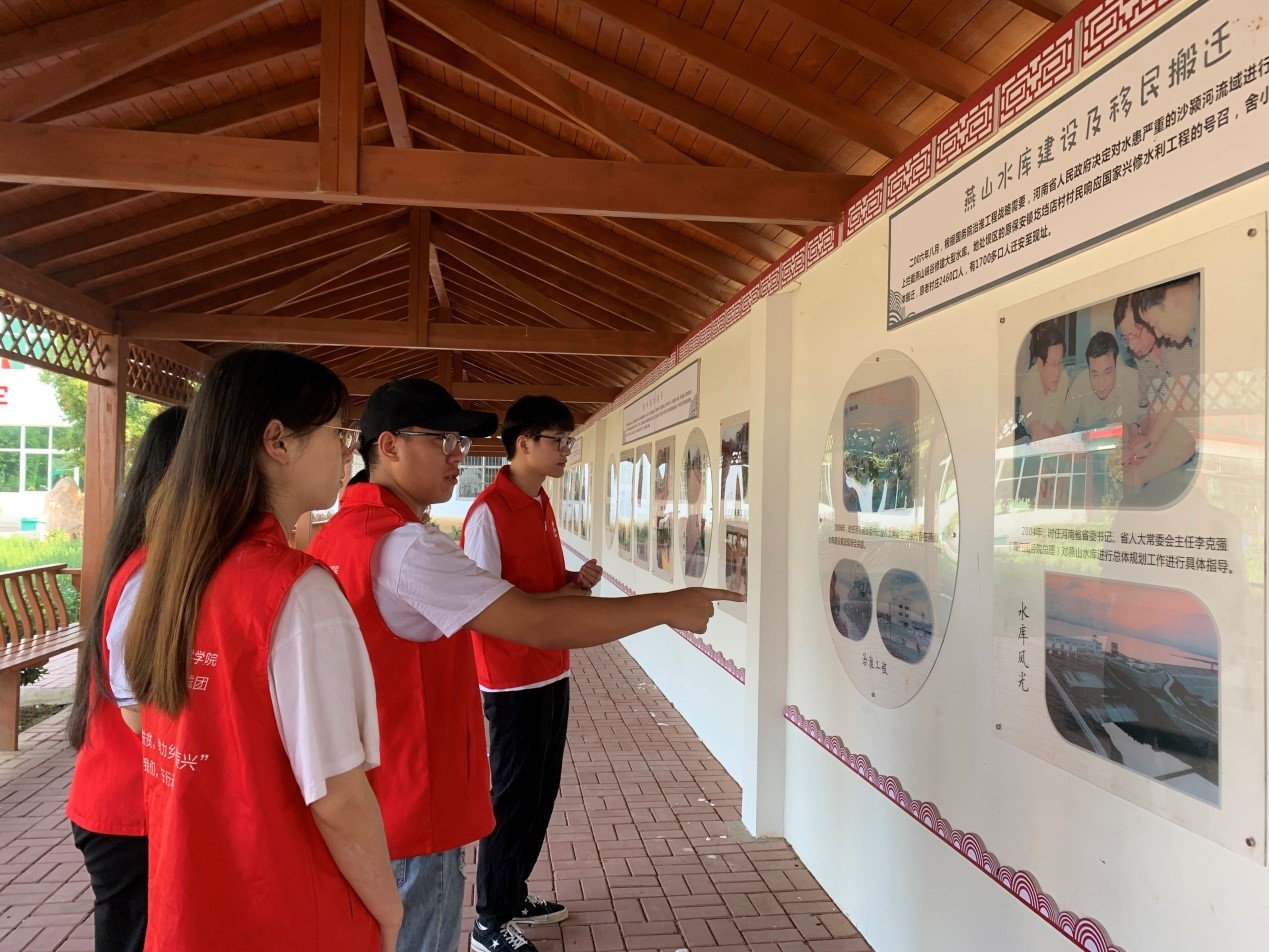 2006年8月,根据国务院治淮工程战略需要,河南省人民政府决定对水患严重的沙颍河流域进行治理,在干江河支流上拦截燕山峡谷修建大型水库,圪垱店村村民为了响应国家号召,建设美丽乡村,舍小家顾大家,实施了整体搬迁。在叶县移民局和昆阳办事处的大力支持下,近几年来,上级陆续在圪垱店移民新村投资600多万元,建设中心办公楼、小学教学楼、文化广场和沿河公园,村外粮田也全部新打了机井,水泥路修遍了田间地头。7月9日实践团队通过参观访问移民村史长廊,了解到新村规划建设。圪垱店村老村房屋多为砖瓦房,土坯房,且道路坑洼不平,环境较差,生活贫困,如今道路宽敞,房屋排列井井有条。特色种植示范园内种有韭菜,迷迭草,月季,芦笋等。为了增加移民收入,村“两委”积极引导群众调整种植业结构,选准高端蔬菜芦笋种植项目,目前,全村种植芦笋1200多亩,为周边群众提供200个就业岗位。随后圪垱店移民新村干部向实践团队员介绍圪垱店村的历史以及发展情况,由生活贫困到如今的生活幸福,习近平总书记说:“青年一代有理想有本领有担当,国家就有前途,民族就有希望。”圪垱店村干部表示:“感谢国家的乡村振兴战略,基于此,农民如今才会过上美好的生活,青年一代更是要拼搏奋斗,你们这个大学生群体正是国家的希望。”