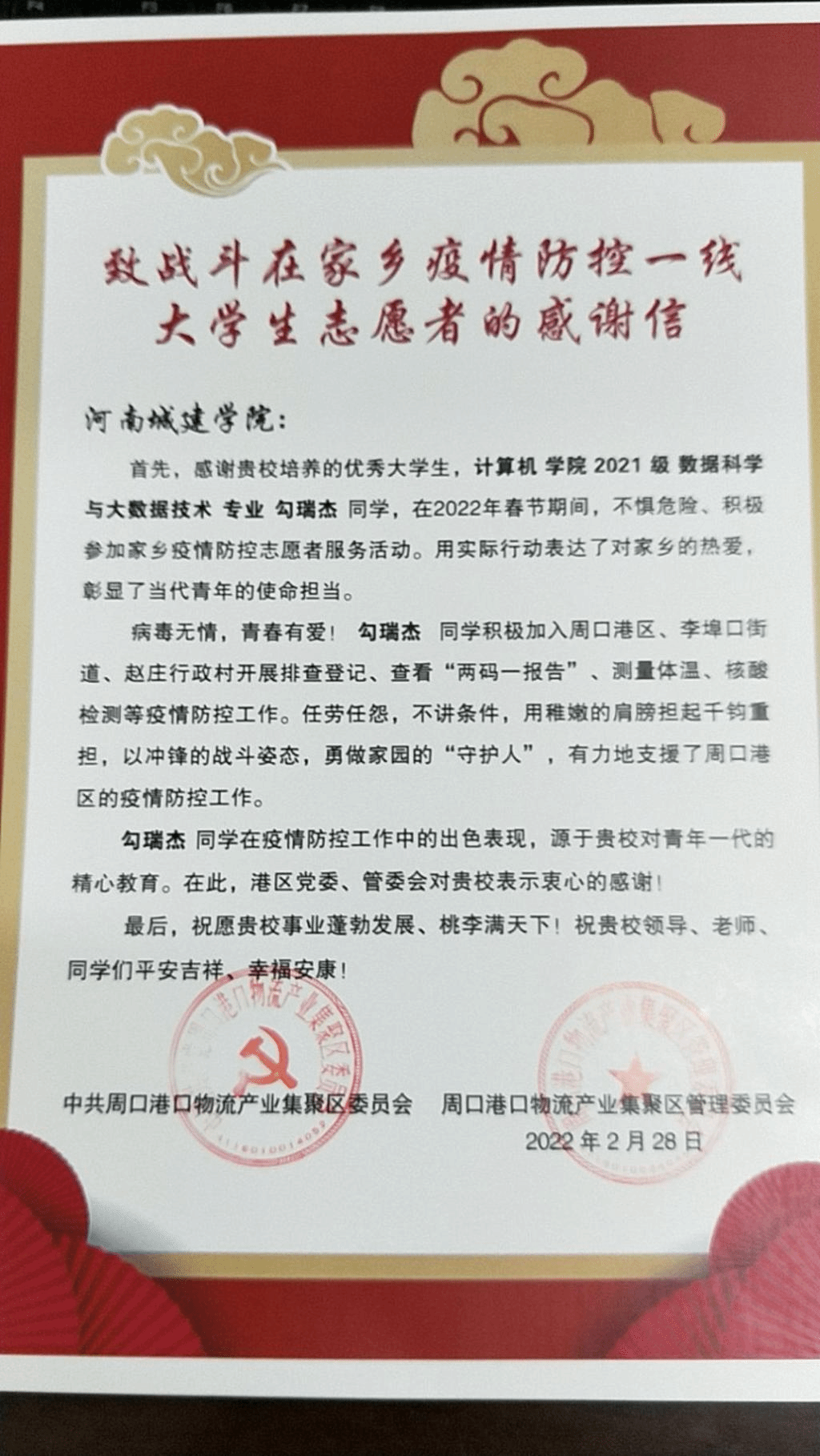 新的一年,初春伊始,我校收到周口市港口物流产业集聚区委员会发来的一封感谢信,信中提到勾瑞杰同学在家乡疫情防控工作中出色的表现,对我校给予了感谢与祝福。